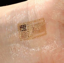 In effetti, se c’è una cosa che Rogers e colleghi sanno fare è costruire circuiti elettronici su supporti ultrasottili, pieghevoli e deformabili. Il materiale di partenza è sempre il silicio, ma i piccolissimi chip sono disposti in uno speciale disegno ondulato su di un supporto elastico che permette al dispositivo di seguire ogni piccolo movimento della pelle.